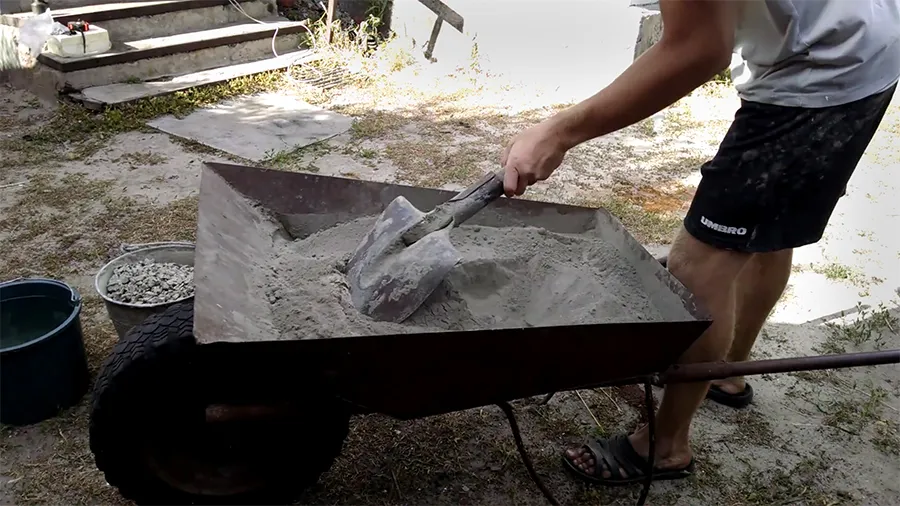 - Организуйте место так, чтобы не носить ведра через весь участок. Поставьте цемент, песок, щебень, воду и емкость для замеса рядом. Чем меньше лишних перемещений, тем меньше риск пролить раствор и травмироваться.