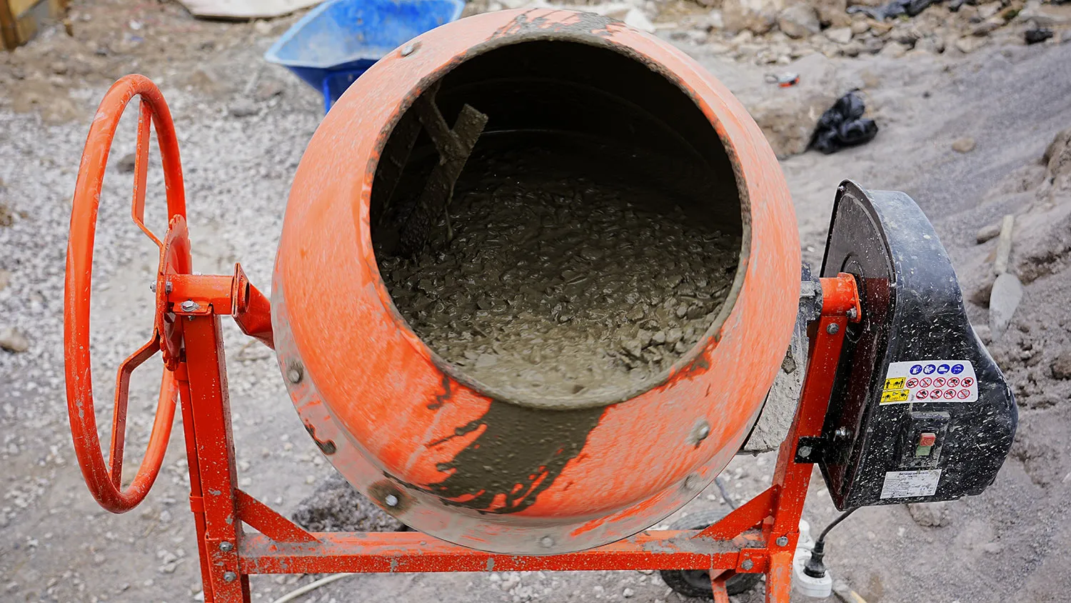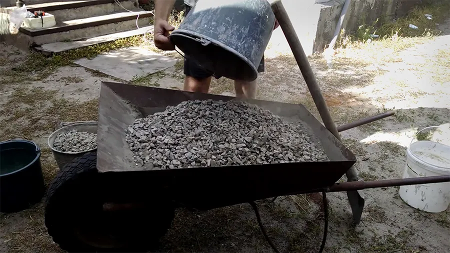 - Загрузите щебень. Он помогает «чистить» барабан: не дает цементу прилипать к стенкам и улучшает перемешивание.