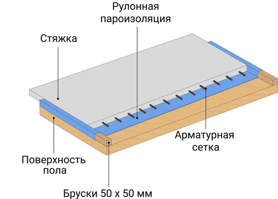 Для заливки используют цементно-песчаную стяжку или самовыравнивающуюся смесь для пола. В помещениях шириной не больше 2 м ровный пол можно залить даже без маячков. В этом случае собирают опалубку из брусков 50 х 50 мм и ориентируются при заливке на их высоту. Стяжку высотой меньше 50 мм делать нельзя — она будет непрочной.