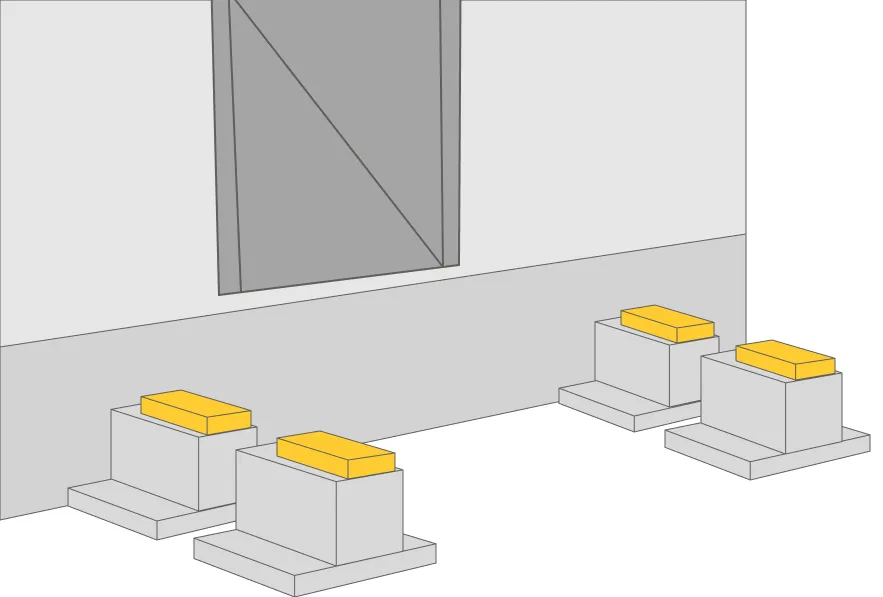 В качестве опорных столбов используйте бетонные фундаментные блоки ФБС 40 х 20 х 20 см. Снизу под блоки подложите тротуарную плитку 40 х 40 х 5 см, сверху — отрезки рулонной гидроизоляции и подкладки из обрезков доски. Подкладки перед установкой пропитайте невымываемым антисептиком.