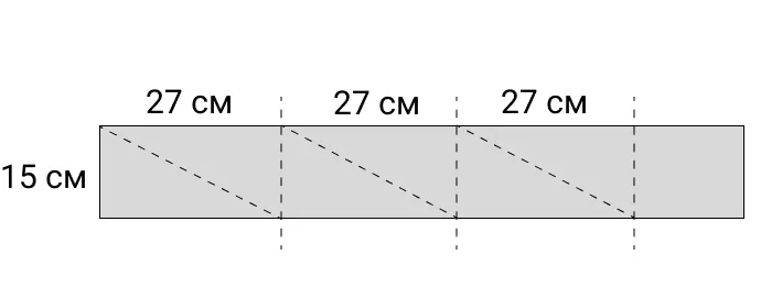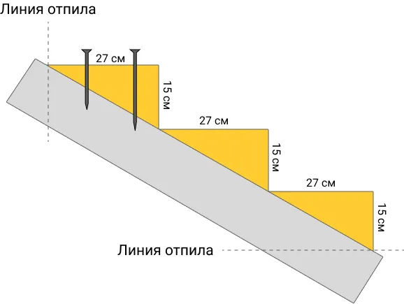 Сделайте заготовки косоуров. Для этого возьмите отрезок доски около 1 м и циркулярной пилой распилите его на одинаковые прямоугольные треугольники со сторонами 15 и 27 см.