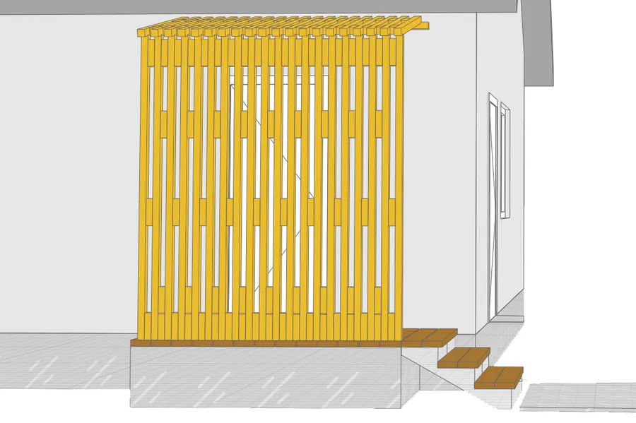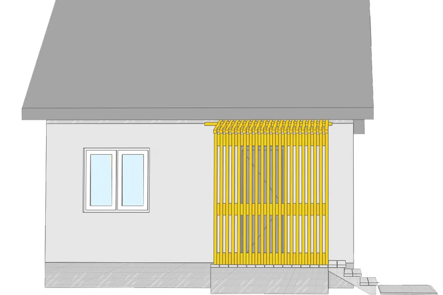 В нашем варианте закрытого крыльца пергола служит и навесом, и ограждающей стенкой. Собирать ее нужно из брусков 50 х 50 мм. Между ними вставляйте прокладки из коротких обрезков такого же бруска. Такая конструкция получится легкой и прочной.