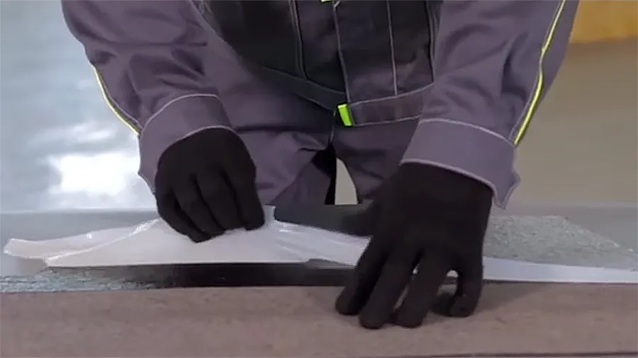 - Если используете самоклеящийся материал — постепенно и аккуратно снимайте защитную пленку (при ее наличии) и прижимайте ковер к настилу. При укладке следующей полосы перекрытие соседних полотен выполняйте с нахлестом не менее 100 мм. Места стыков дополнительно прокатайте прижимным валиком.