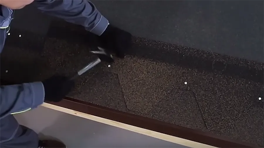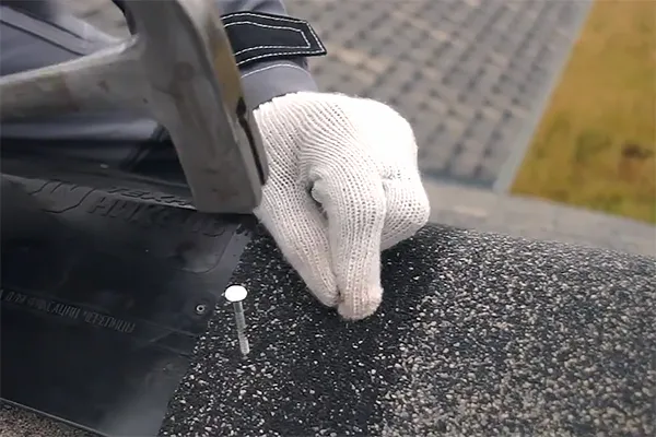 - Зафиксируйте полосу кровельными гвоздями с шагом 10–15 см — не менее 12 гвоздей на один гонт.