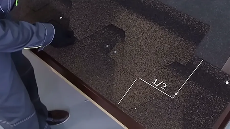 Следующий ряд гибкой черепицы уложите со смещением на 1/3 или 1/2 лепестка — точная величина указана в инструкции (это актуально для материала с подгоном рисунка). При укладке нужно следить, чтобы лепестки верхнего ряда закрывали места крепления гонтов предыдущего — это обеспечивает герметичность мягкой кровли.