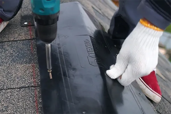 - Закончив укладывать черепицу на ребра кровли, переходите на конек. Сначала с помощью шуруповерта саморезами зафиксируйте коньковый аэратор. Крепеж вкручивайте в специально обозначенные на нем места.