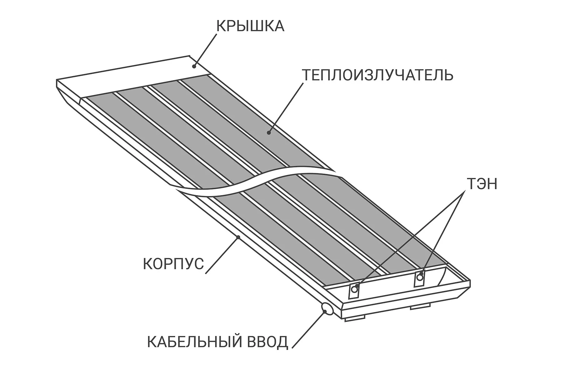 Подобного эффекта позволяет добиться ТЭН (трубчатый электронагреватель), который раскаляет пластину из металла или керамики внутри ИК-прибора. Температура нагрева вырастает до 250 °С, что позволяет ей эффективно излучать тепло.