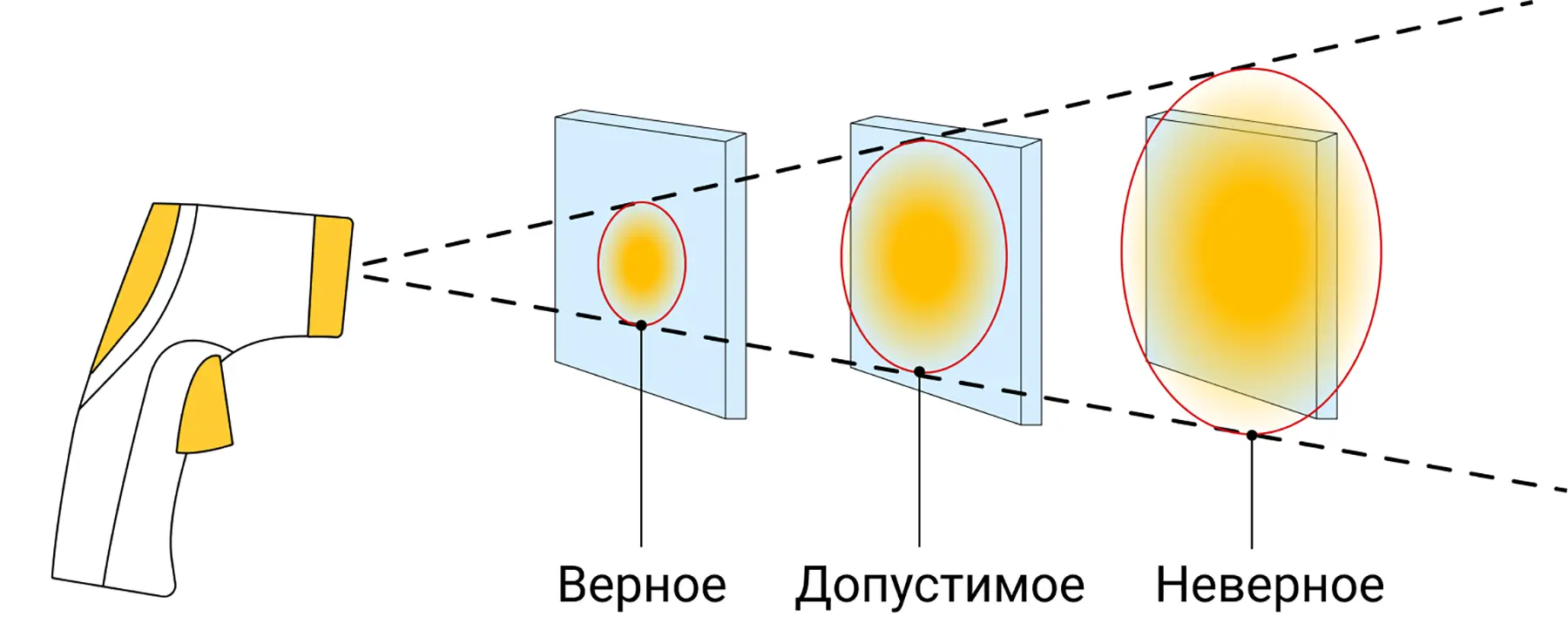 Представьте себе включенный фонарик. Чем ближе он к стене, тем меньшую площадь освещает, а чем дальше от стены, тем эта площадь больше. По этому же принципу действует пирометр: чем больше расстояние от объекта, тем шире площадь охвата. Если отойти слишком далеко, в область действия прибора могут попасть предметы с другими характеристиками поверхности, и измерения будут неточными.