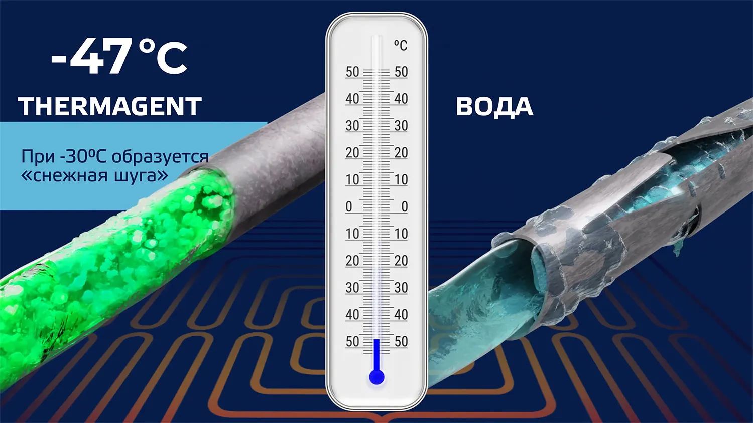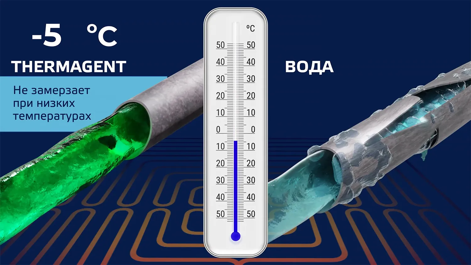 Ключевое отличие в том, что антифризы не замерзают, как вода. Когда температура опускается ниже нуля, такой теплоноситель лишь слегка густеет. При дальнейшем похолодании в нем образуется снежная шуга — густая зернистая масса, которая не превращается в твердый лед и позволяет сохранить циркуляцию в системе даже в сильный мороз. Незамерзающая жидкость не расширяется, как это делает вода при превращении в лед, благодаря чему трубы и радиаторы не разрывает при морозах.