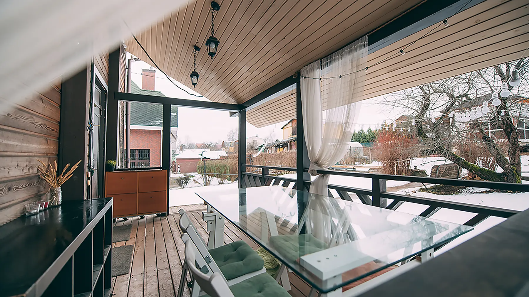 По строительным нормативам террасы и веранды не могут быть отапливаемыми, их не подключают к системе отопления дома. Но чтобы с комфортом отдохнуть здесь в холодное время года, можно установить инфракрасные обогреватели.