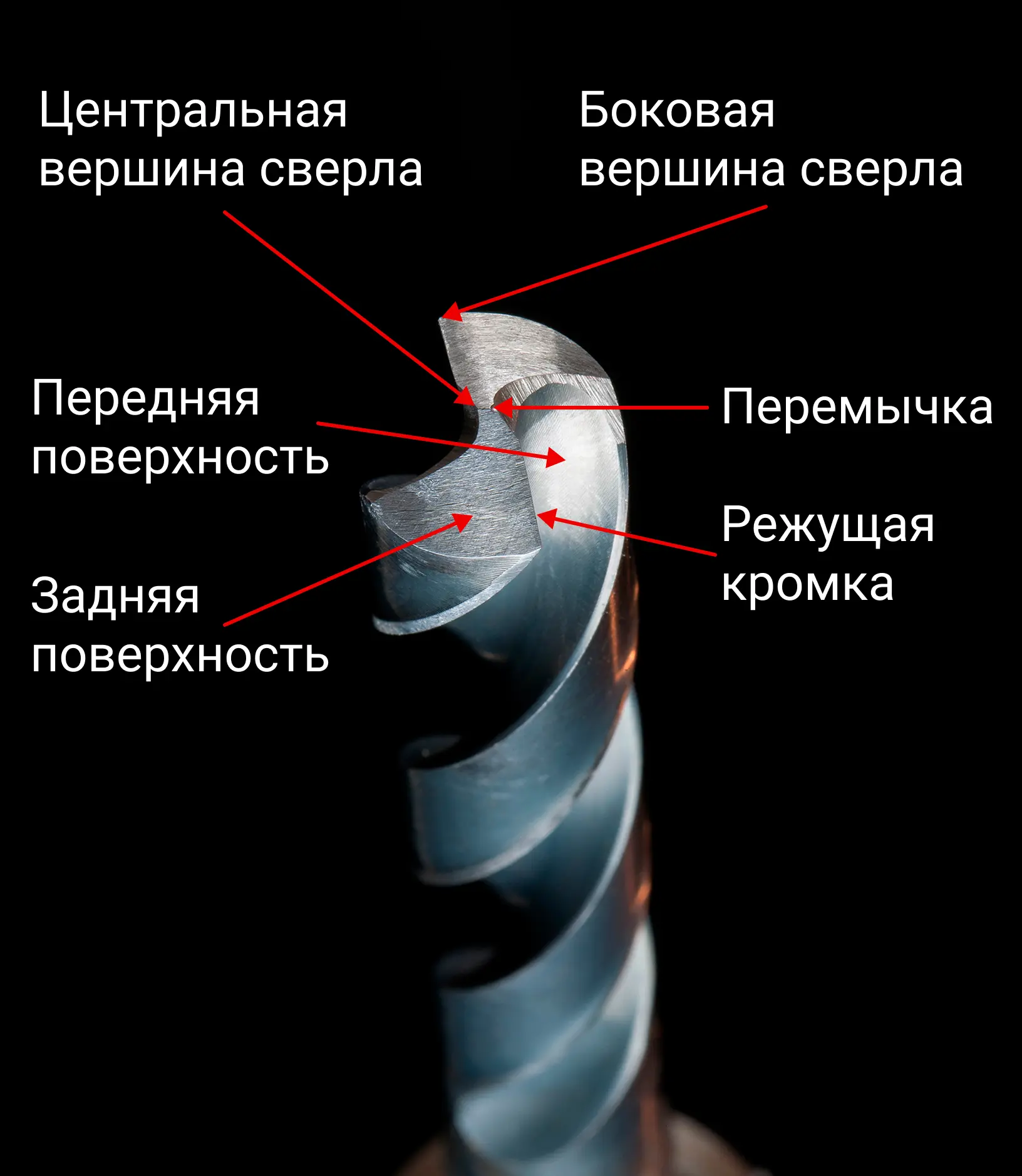 - Задняя поверхность — участок за режущей кромкой. Создает небольшой зазор, чтобы сверло не терлось о материал.