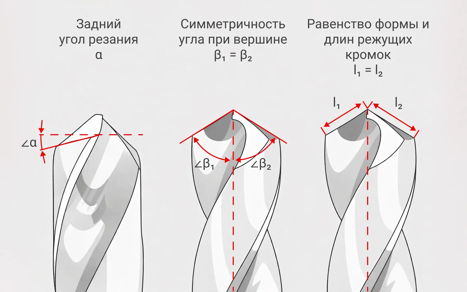 Далее измеряют симметрию: у обеих режущих кромок должна быть одинаковая длина и углы наклона. Проверить параметры можно несколькими способами: