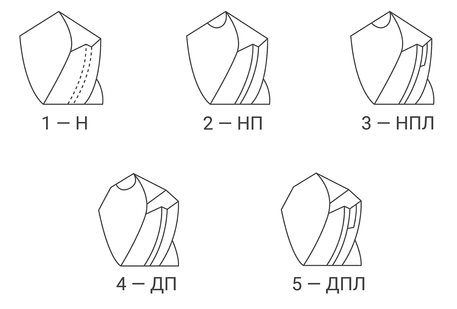 Одинарную заточку (Н) выбирают для сверл диаметром до 12 мм, все остальные виды — для 12–80 мм.