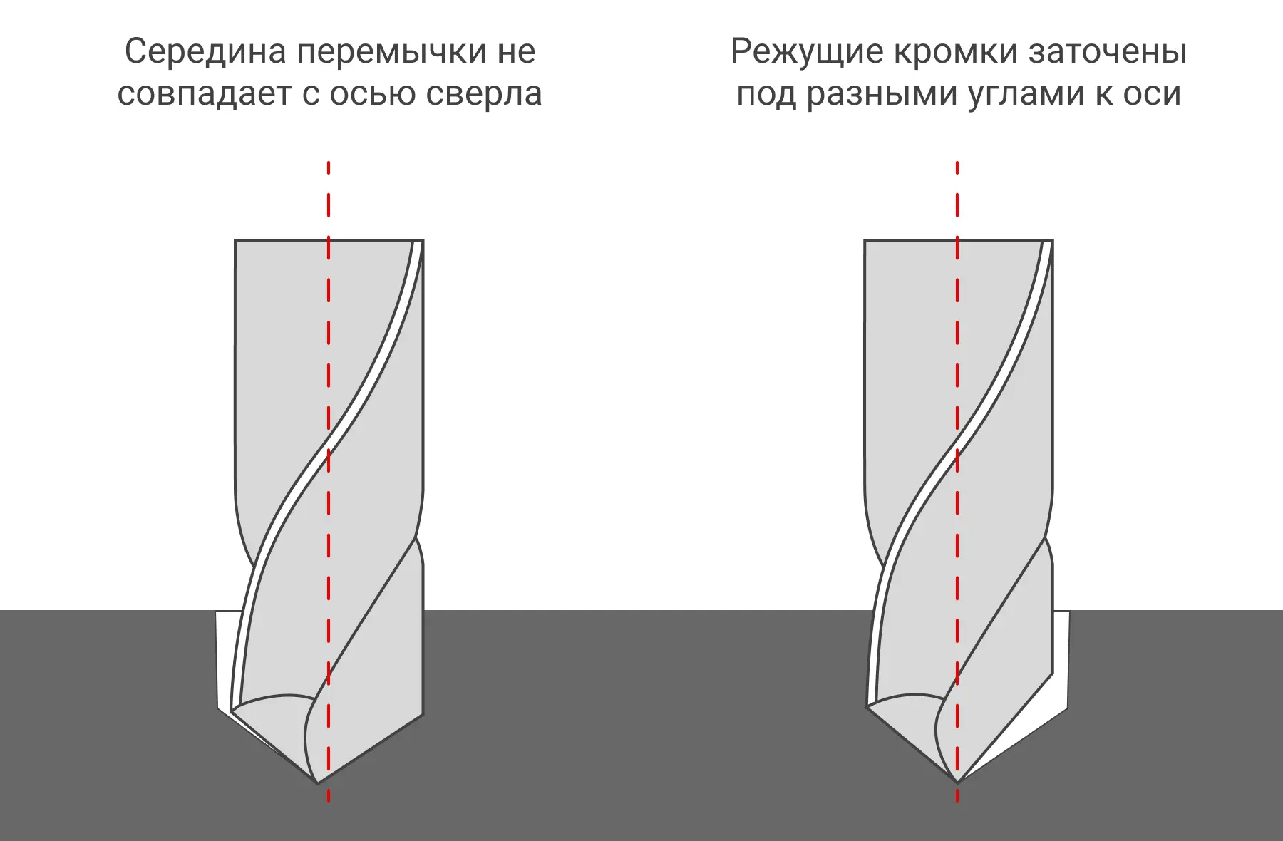 Кроме этого, важно соблюсти центровку перемычки (поперечной кромки) — она должна находиться строго по центру оси оснастки. Если перемычка смещена влево или вправо, то при сверлении одна режущая кромка будет работать сильнее другой. Это вызовет биение, вибрацию и приведет к увеличению диаметра отверстия.