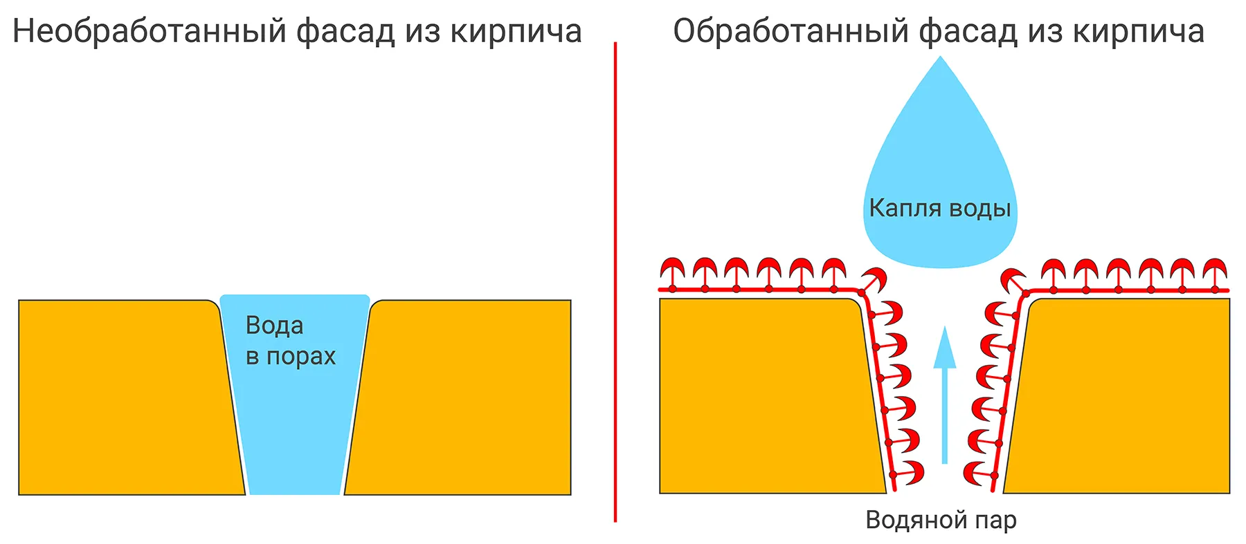 Процедура действительно создает водоотталкивающий эффект, заставляя влагу скапливаться на поверхности и быстро стекать. Однако при сильном напоре воды (под прямой струей из шланга или ливне) часть жидкости может проникать внутрь фасада. Это связано с обволакивающими свойствами гидрофобизатора, частицы которого проникают внутрь только подходящих по размеру отверстий. Микропоры при этом остаются открытыми, давая поверхности возможность дышать и выводить пар наружу.