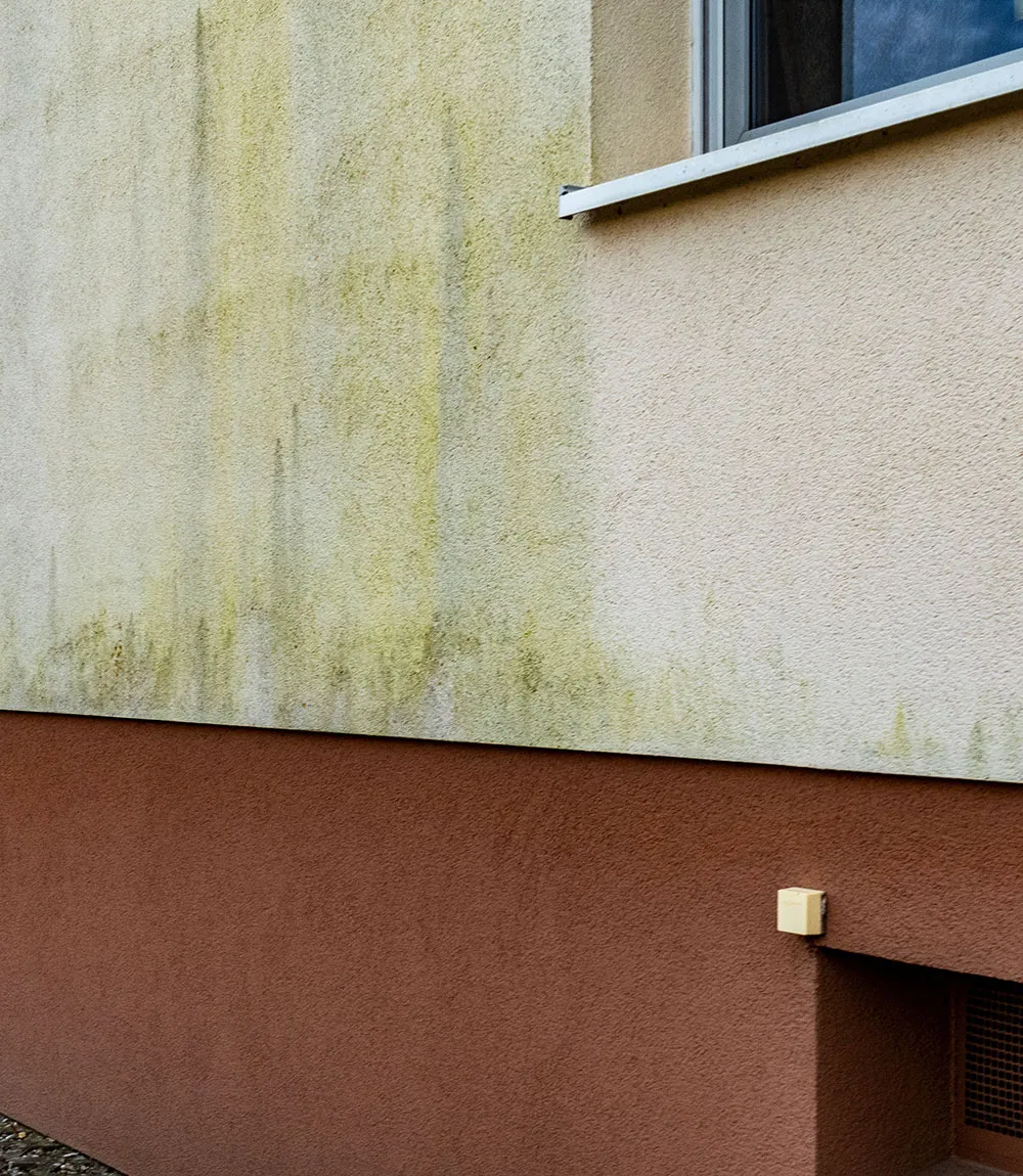 Если на фасаде есть специфические загрязнения — плесень, жир или островки из мха — сперва необходимо избавиться от них, а затем переходить к общей помывке. Используйте специализированные очистители для обезжиривания, удаления высолов, цементного налета, мха и плесени. Их разводят по инструкции и наносят любым удобным способом: