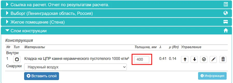 Во вкладке «Слои конструкции» добавьте слой с параметрами, соответствующими вашей стене дома.