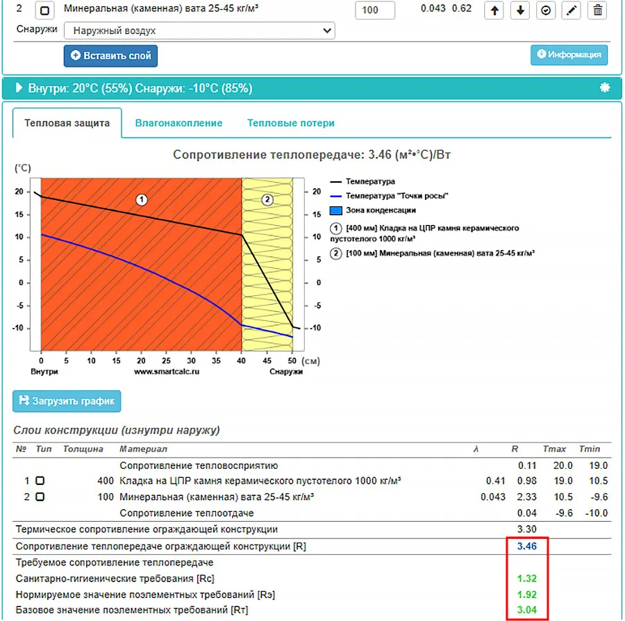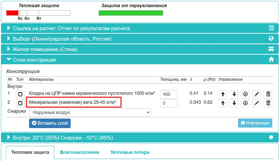 Подбирайте толщину утеплителя, пока калькулятор не покажет, что получившаяся конструкция удовлетворяет всем нормам по тепловой защите (значения сопротивления теплопередаче должны быть зелеными, а не красными). Результат: для утепления кирпичной стены нужен слой минваты толщиной 100 мм.