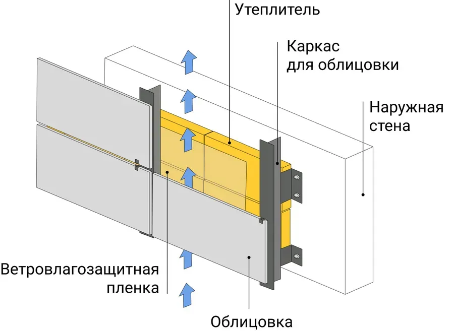 Если есть перепады больше 9 см, стену грунтуют. Затем к несущей стене крепят утеплитель, накрывают его ветро-влагозащитной пленкой, а поверх нее на металлический каркас устанавливают облицовочные материалы: панели, сайдинг, облицовочный кирпич, натуральный или искусственный камень. Между облицовкой и утеплителем оставляют вентиляционный зазор от 20 до 50 мм, где свободно циркулирует воздух, который защищает конструкцию от влаги и конденсата.