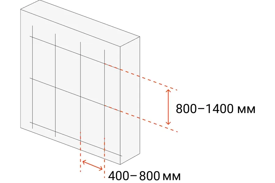 Отступите от углов по 100 мм и расчертите стену на прямоугольники размером 800–1400х400–800 мм. Точки пересечения линий должны находиться на расстоянии 35 мм от ложкового и 60 мм от тычкового швов кирпичной кладки. Такие расстояния гарантируют, что кирпич (особенно если он пустотелый) не разрушится от сверления.