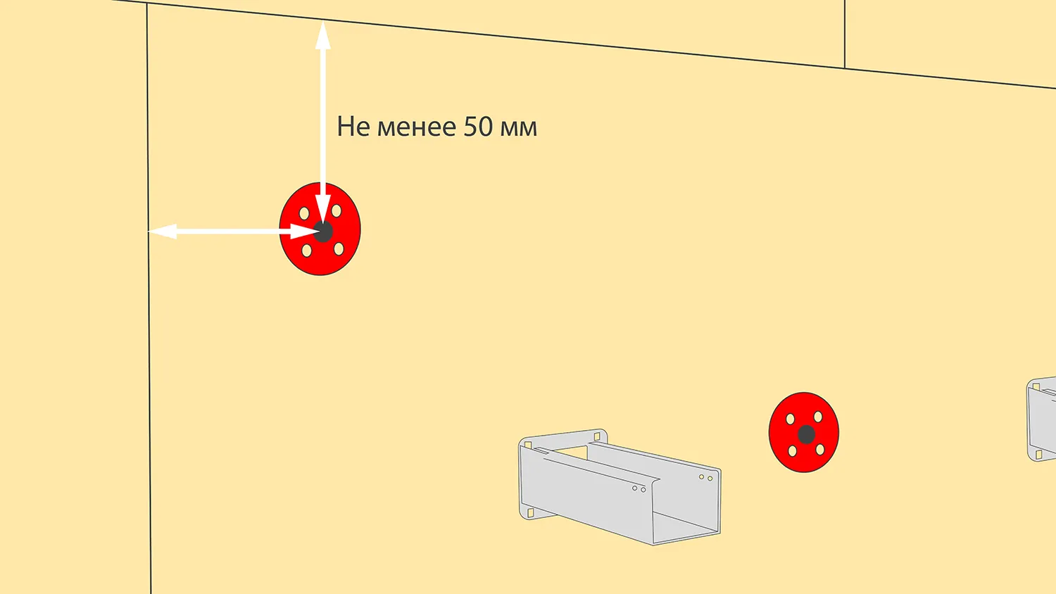 Дополнительно зафиксируйте плиты на стене тарельчатыми дюбелями в пяти местах — по углам и в центре. Для этого прямо через утеплитель просверлите в стене отверстия для дюбелей. Вставьте крепеж и вкрутите, чтобы он вошел в стену не менее чем на 6 см. Расстояние от тарельчатого дюбеля до края плиты должно быть не менее 50 мм.