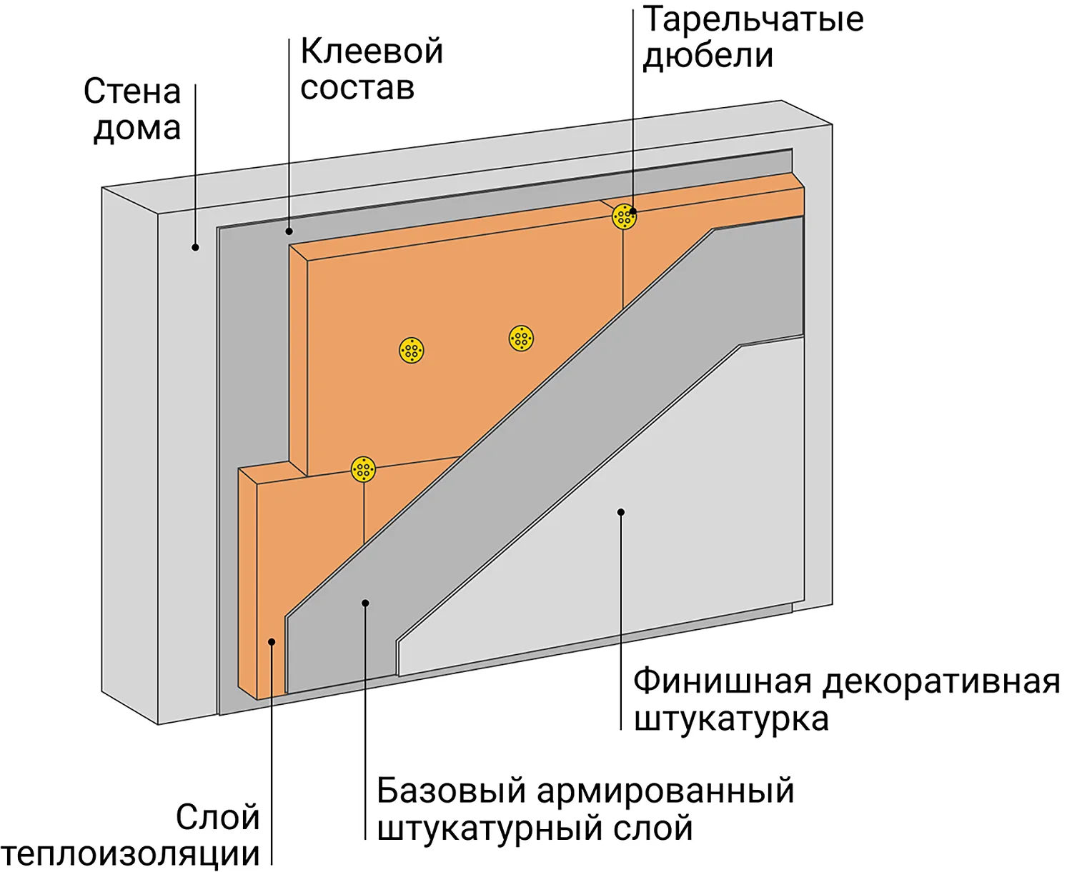 Этот способ также называют СФТК — система фасадная теплоизоляционная композитная. Основное отличие от вентфасада в том, что отделку монтируют непосредственно на утеплитель и не используют ветро-влагозащиту.