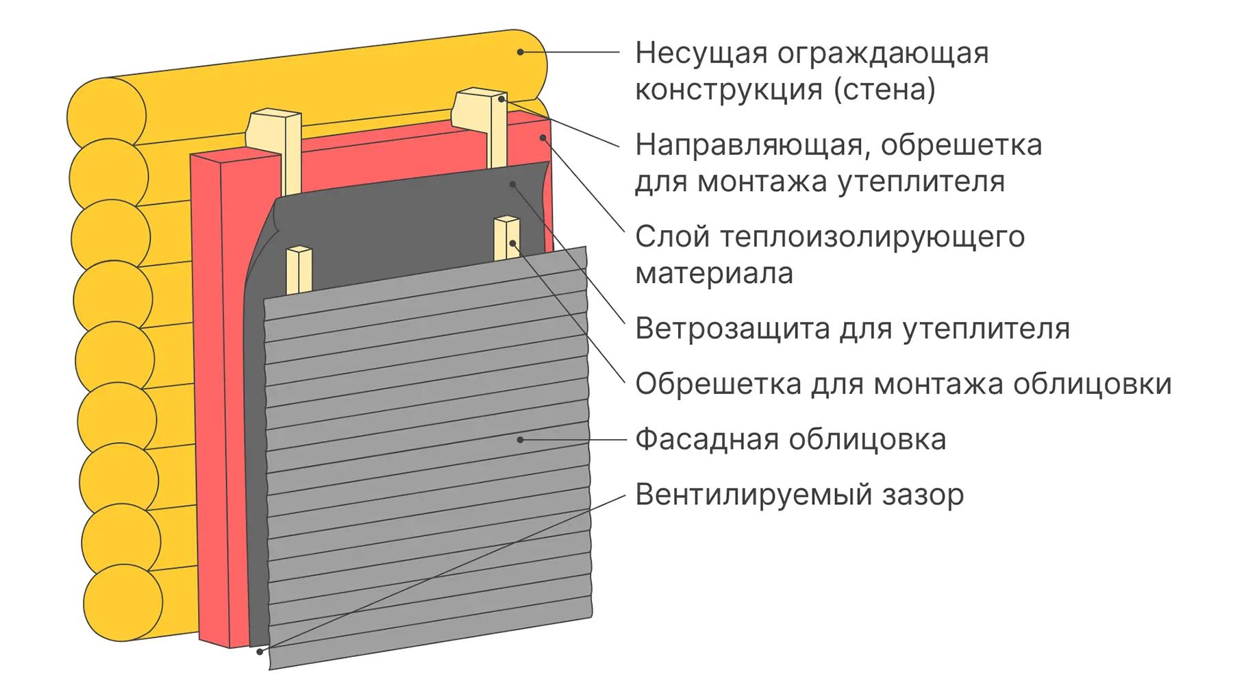 СФТК состоит из нескольких слоев, уложенных на подготовленное основание (стены дома):
