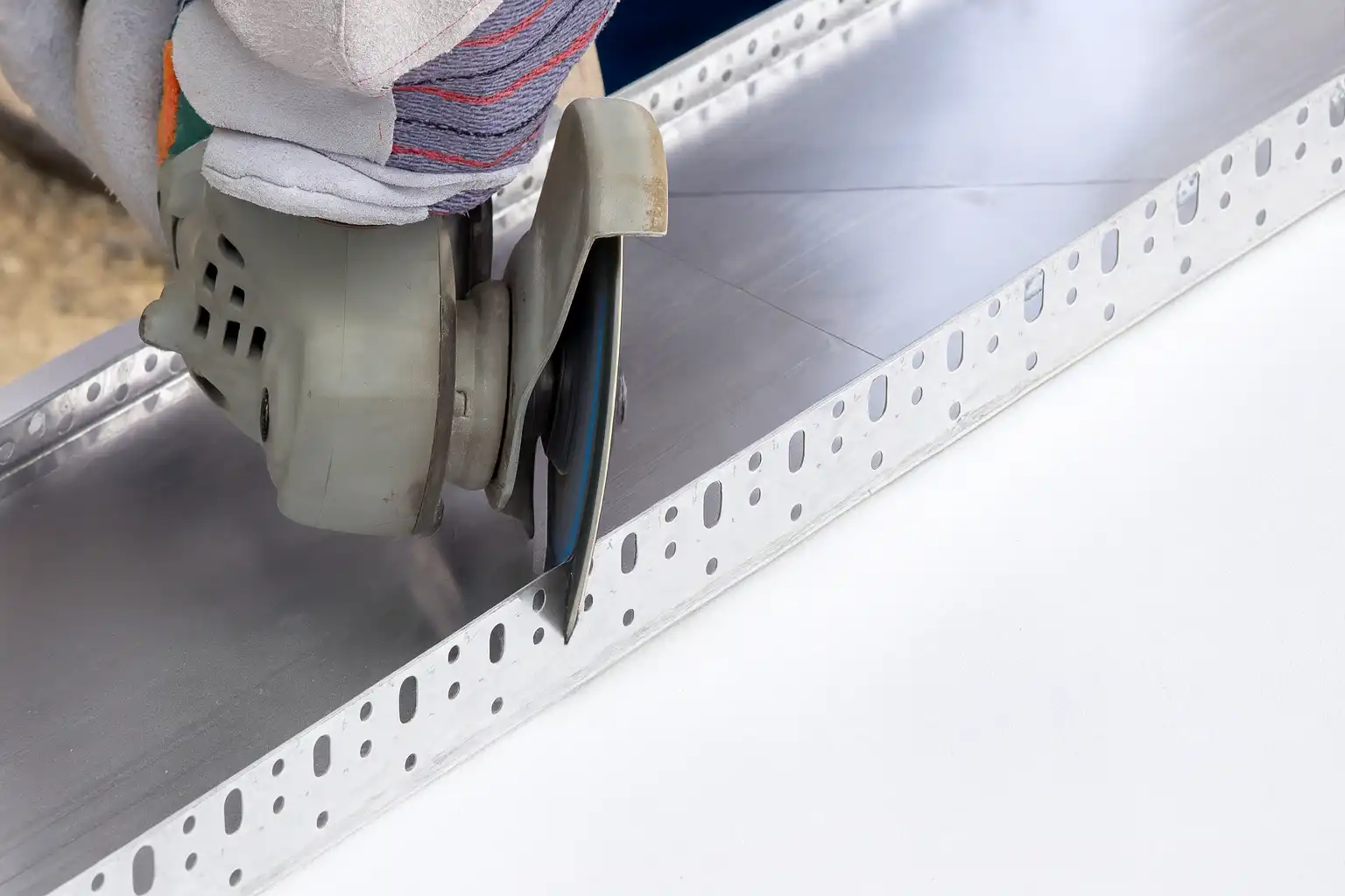 Снимите размеры стен рулеткой. Нарежьте цокольный профиль на отрезки. Сделайте загибы для углов: с помощью УШМ с пильными дисками вырежьте из профиля равнобедренный треугольник.