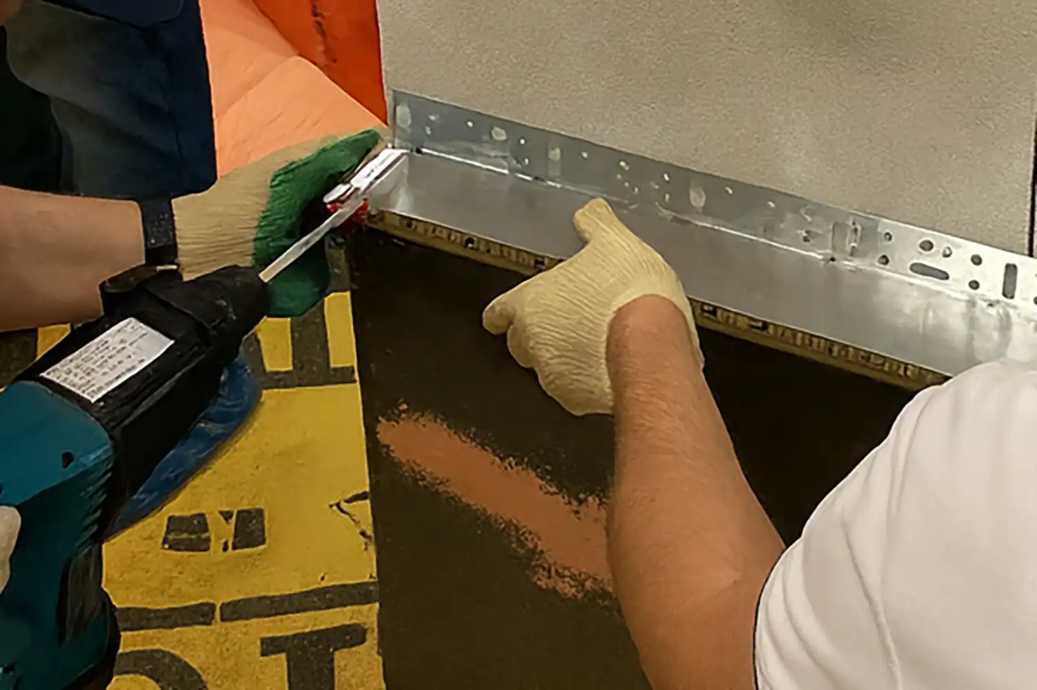 Подставьте к местам сверления компенсаторы толщины. Вставьте в отверстия дюбели. Благодаря этому шагу металл не погнется.