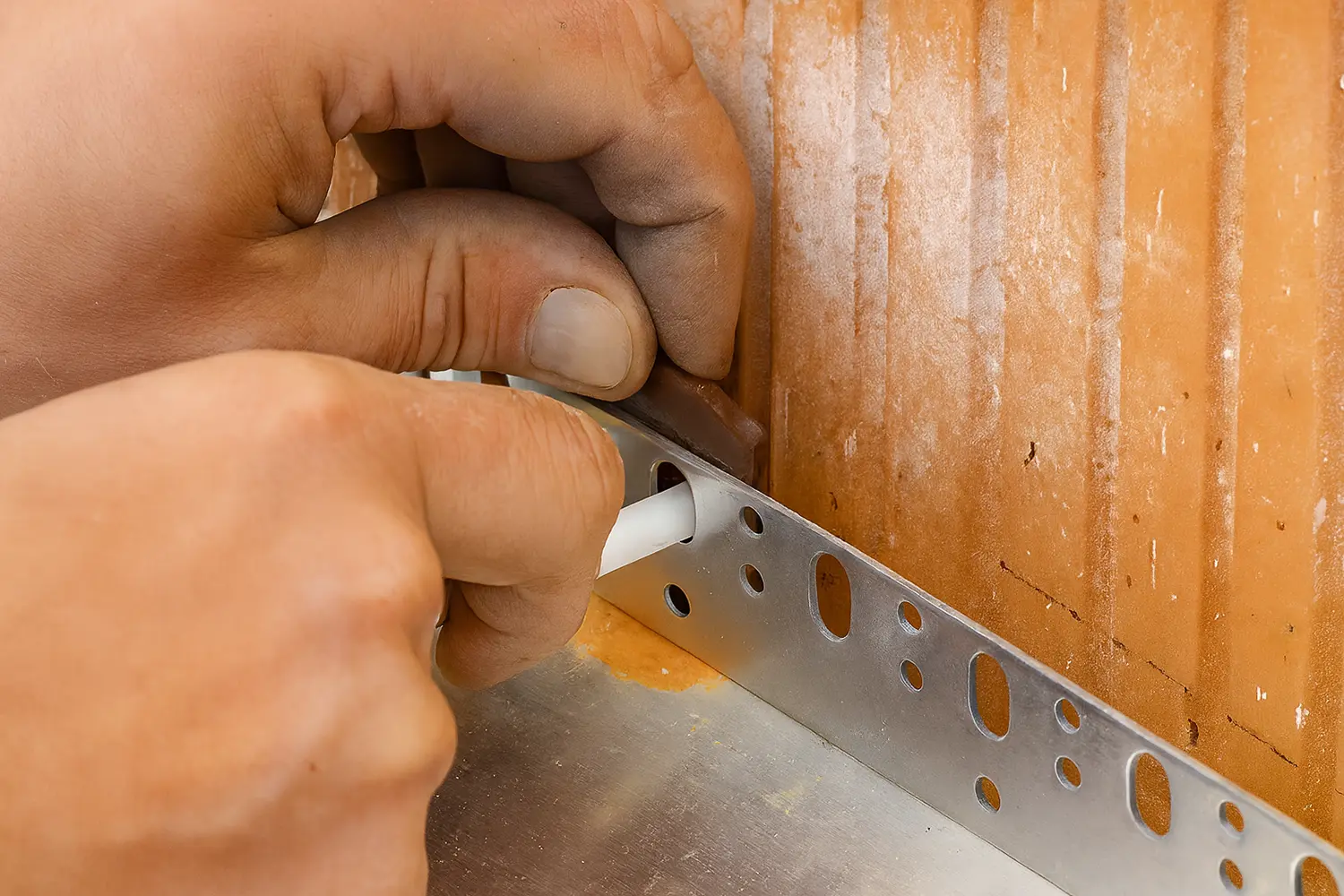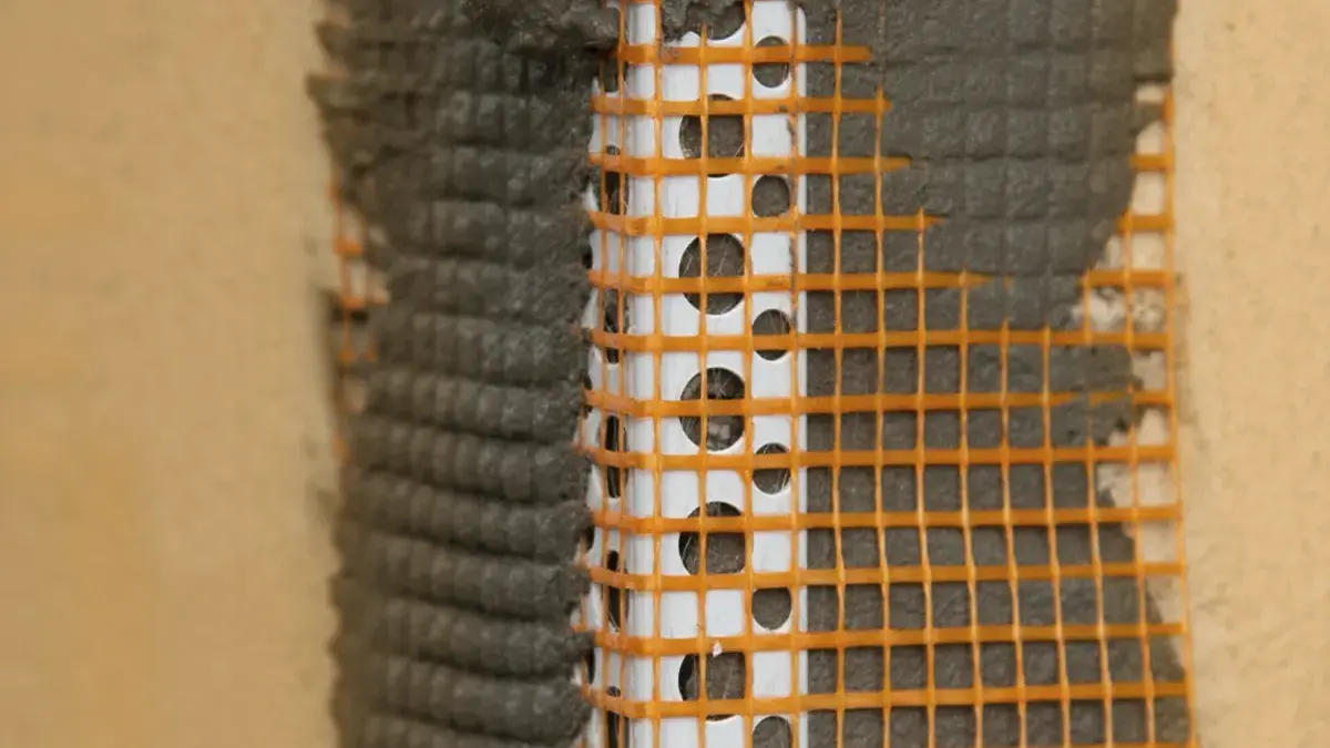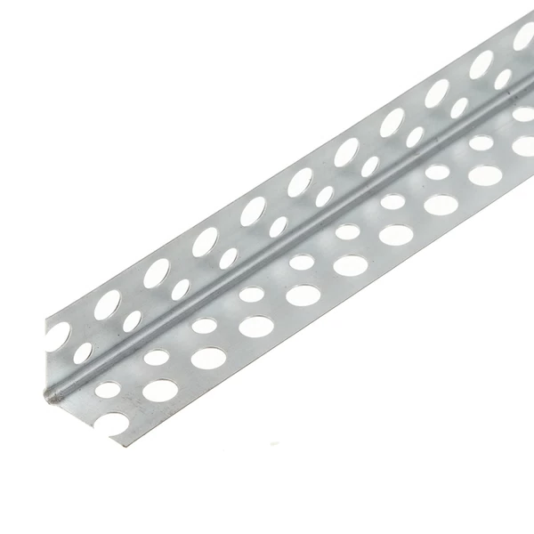 - Углы армируют не только фасадной сеткой, но и перфорированными пластиковыми или алюминиевыми уголками. Их одновременно вдавливают в армирующий слой и штукатурят сверху.