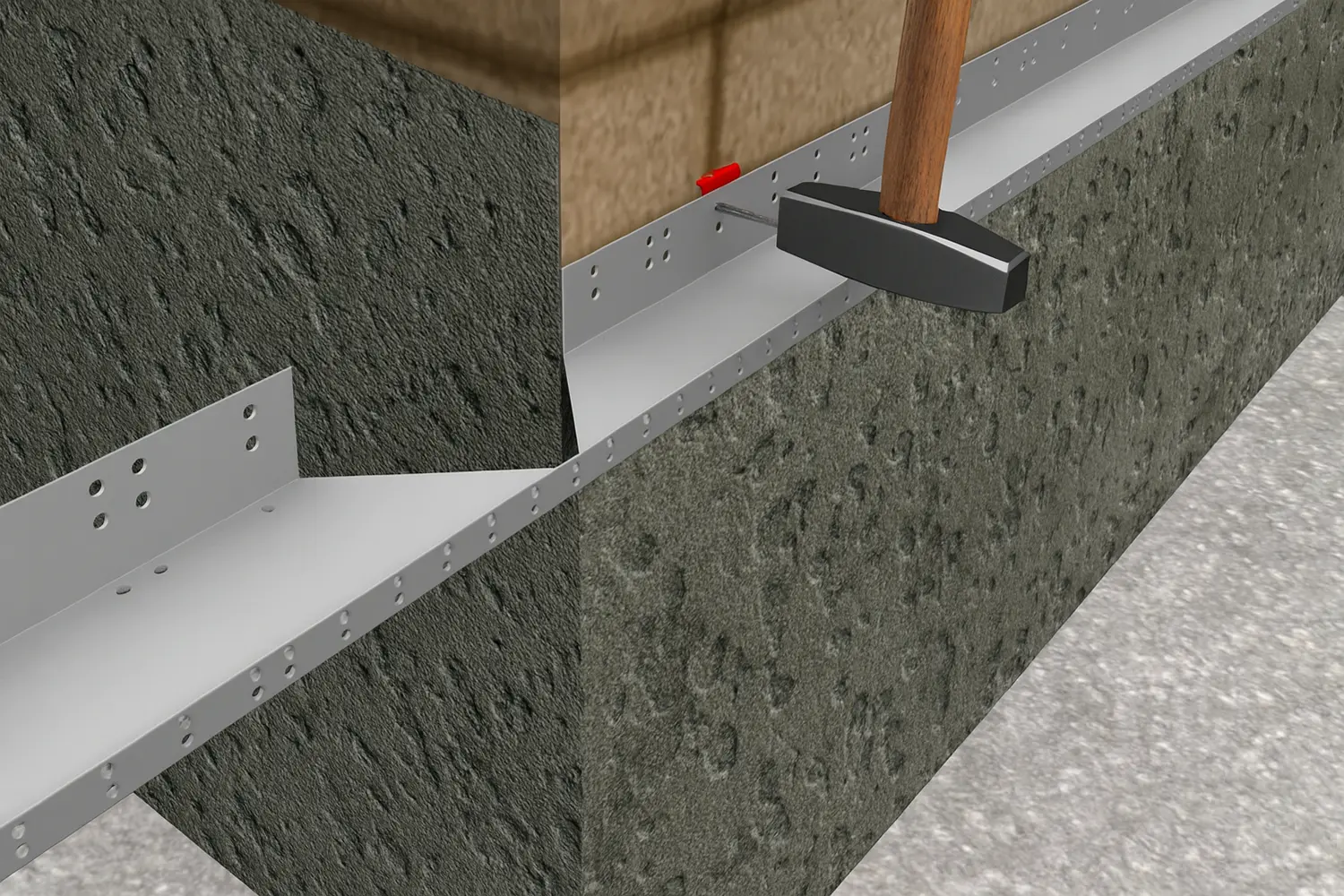 Зафиксируйте цокольный профиль на стене: вставьте в дюбели гвозди и забейте молотком до упора.