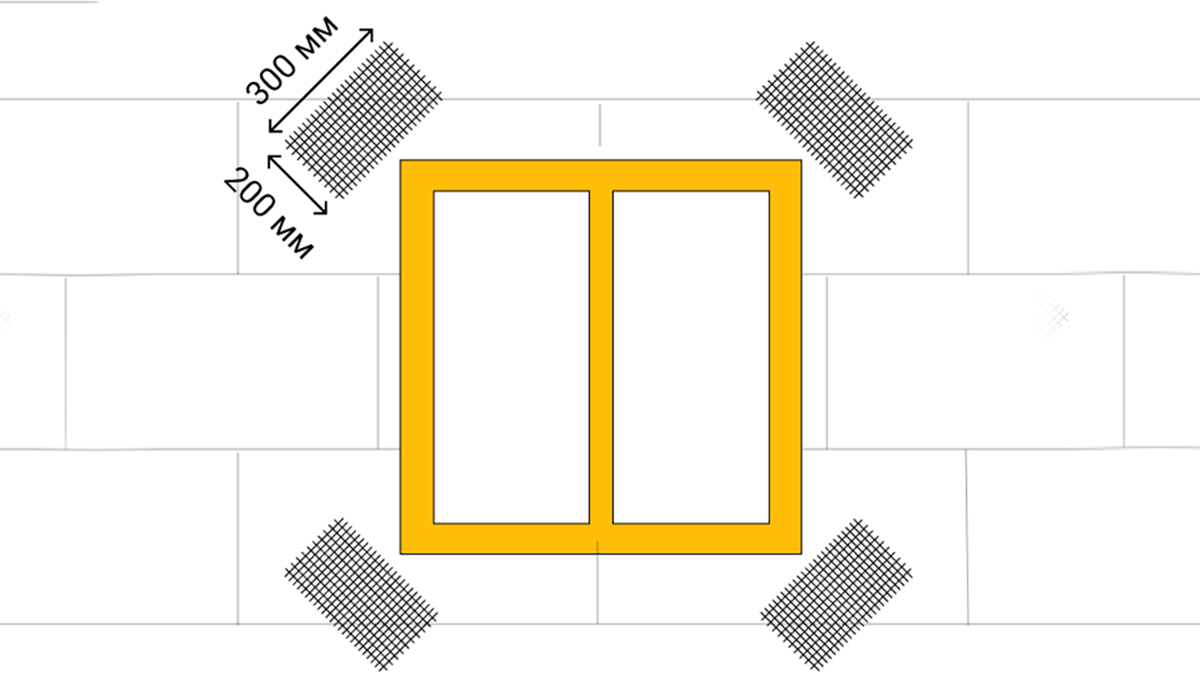 - В углах оконных и дверных проемах делают диагональные вставки из стеклосетки размером 30×20 см под углом 45 градусов. Они усиливают конструкцию, предотвращают растрескивание в точках напряжения. Ширину нахлеста сетки в этих местах увеличивают до 15–20 см.