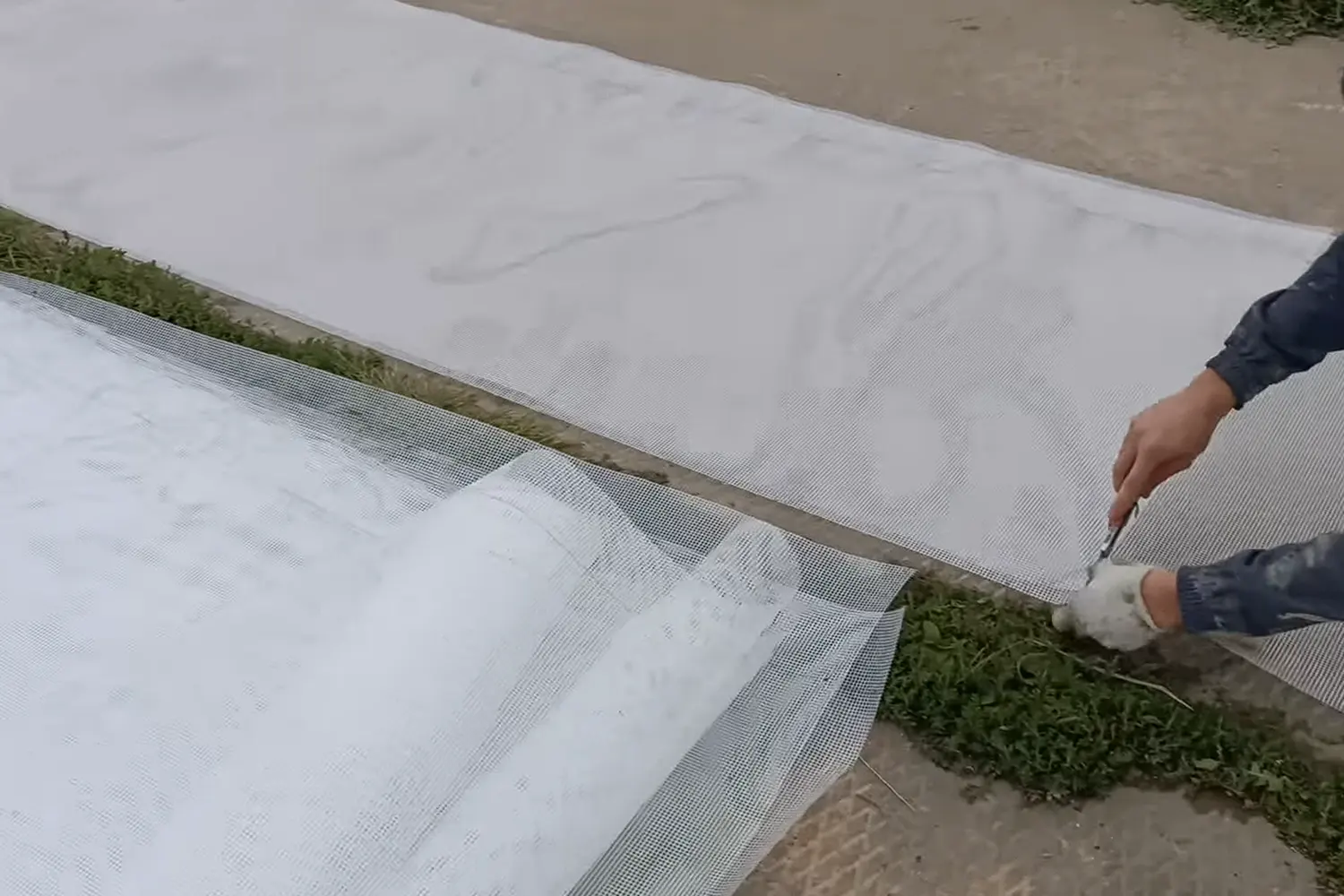 Измерьте стены рулеткой. Строительным ножом нарежьте армирующую сетку на куски. Замешайте базовую штукатурку.