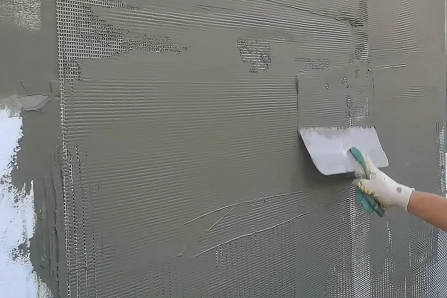 После укладки полностью закройте сетку раствором. Разровняйте его шпателем до получения гладкой поверхности. Толщина готового армирующего слоя ― 5–6 мм.