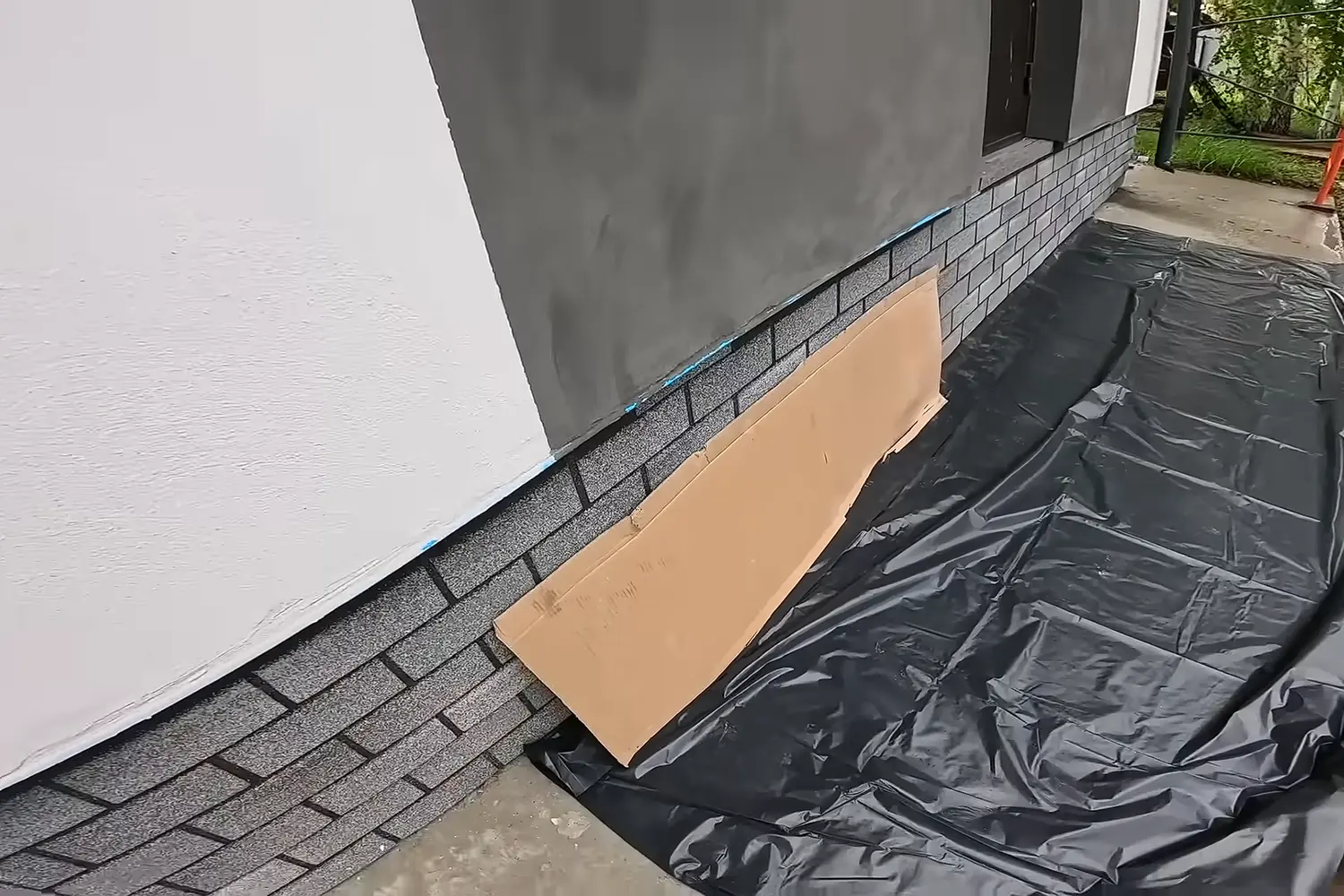 Убедитесь, что армирующий слой полностью высох. При необходимости укройте цоколь дома картоном, чтобы не испачкать его во время работы.