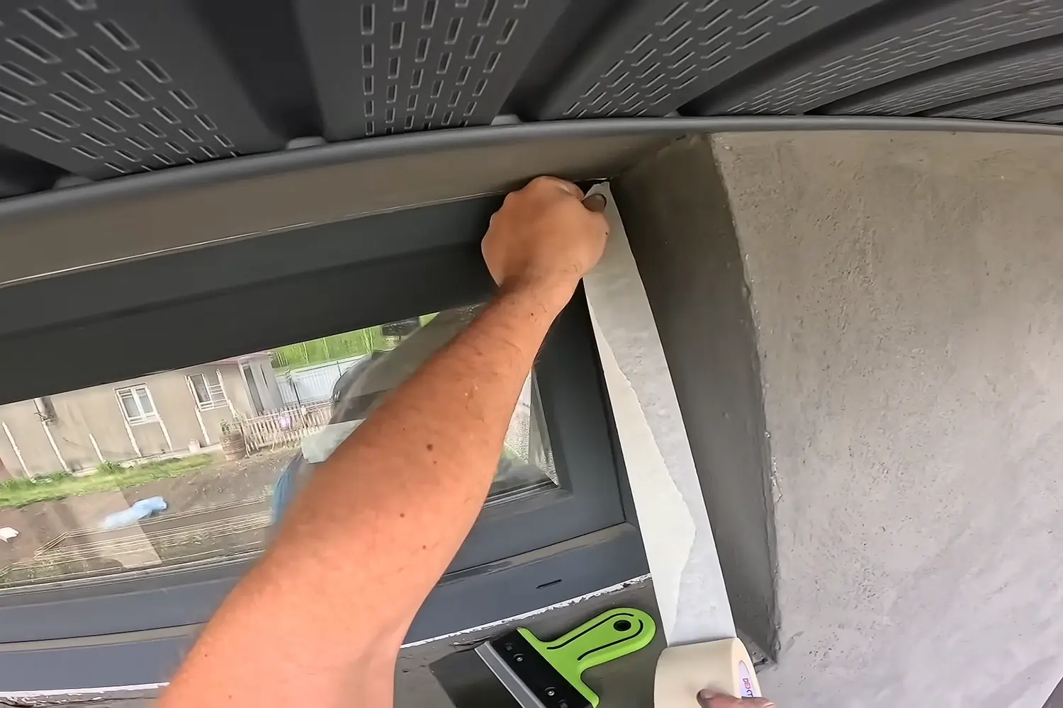 Малярным скотчем проклейте оконные и дверные рамы. Так они останутся чистыми.